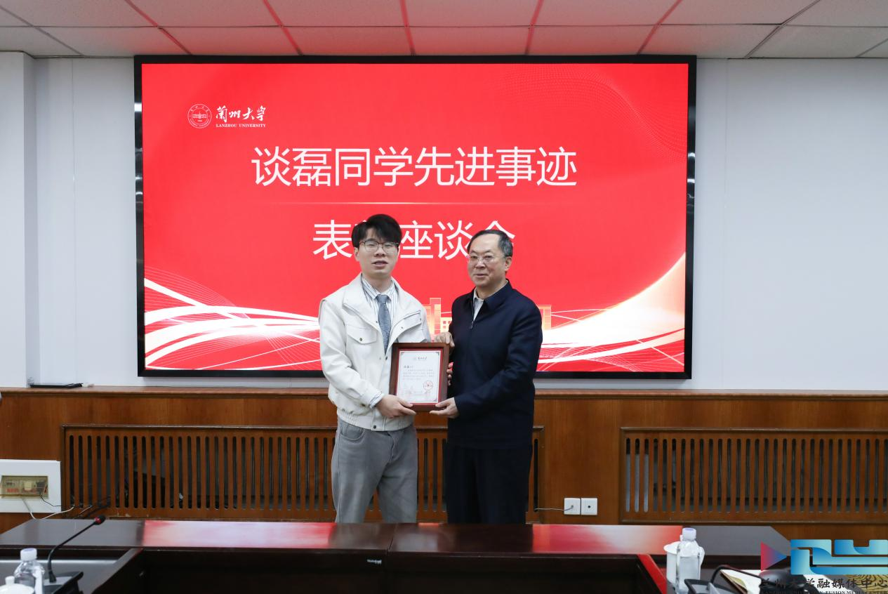 为表彰先进、树立榜样,弘扬兰大精神,3月9日上午,兰州大学在城关校区召开谈磊同学先进事迹表彰座谈会。兰州大学校长杨勇平、党委副书记曹爱辉、副校长刘翔、校长助理李永春出席会议。会议由刘翔主持。